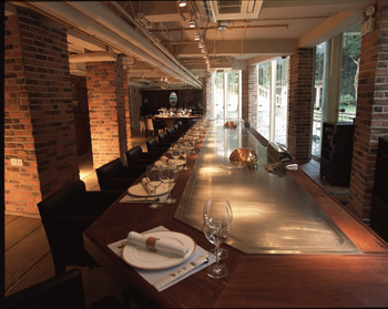 各種風味餐廳的VI設計風格應該以其風格迥異、鮮明的地方性特征。如廣東餐廳應突出熱帶氣氛,上垂吊蘭,下置盆栽,墻面及家具均以綠色為主調,加以東南兩面外窗竹簾低垂,凸顯南國意境。淮揚餐廳的格調應以端莊為宜,不等邊六角形平面的周邊布置固定的小餐位,圍繞中心兩組大圓桌;頂棚上相應懸掛兩組晶體吊燈,光彩照人,廳內鮮花盛開,香氣襲人;地面、墻面及家具均用暖色調,烘托出江淮的情調。如圖1-4為風味餐廳設計效果圖。
