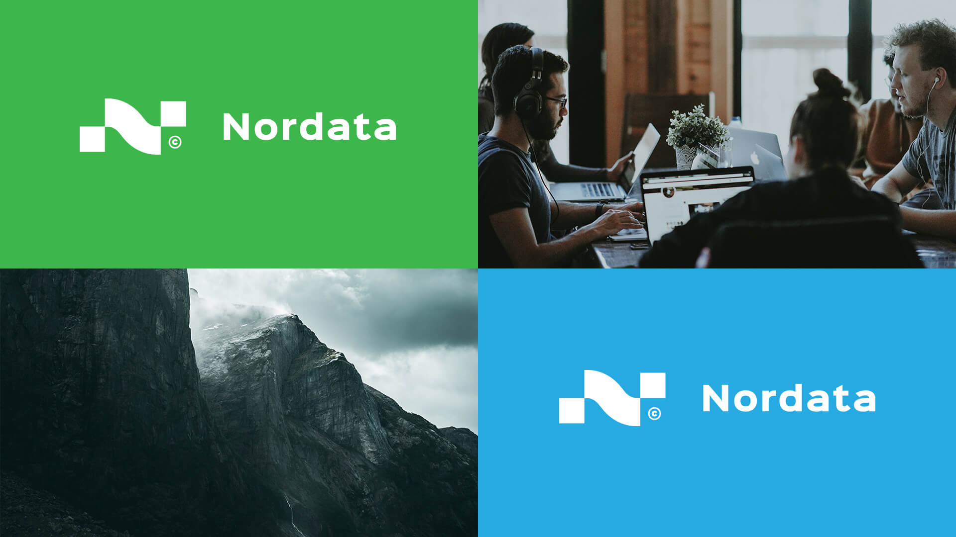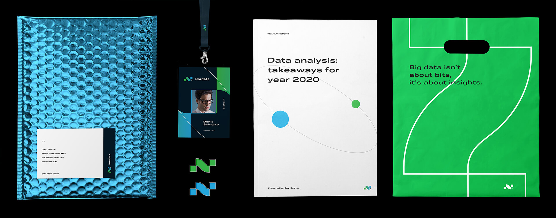 Data-driven marketing company logo and brand identity. The brand name combines two words: "North" and "Data". The final logo represents the letter "N", which consists of two clusters of data that are interconnected. Since the company operates in the northern region, the color scheme of the visual identity reflects the aurora or, in other words, the northern lights.